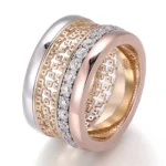 Tri-Tone Moissanite Ring weaves interlocked bands in three noble metals: cool tone outer embracing warm tone filigree lattice, anchored by 0.87ctw round-cut moissanite circlet. Moissanite’s high-refraction facets ignite prismatic flares through the pierced goldwork, while contrasting metallic textures dimensional interplay. Crafted for those who demand excellence. This ring isn’t just jewelry; it’s legacy.