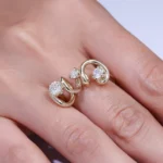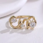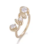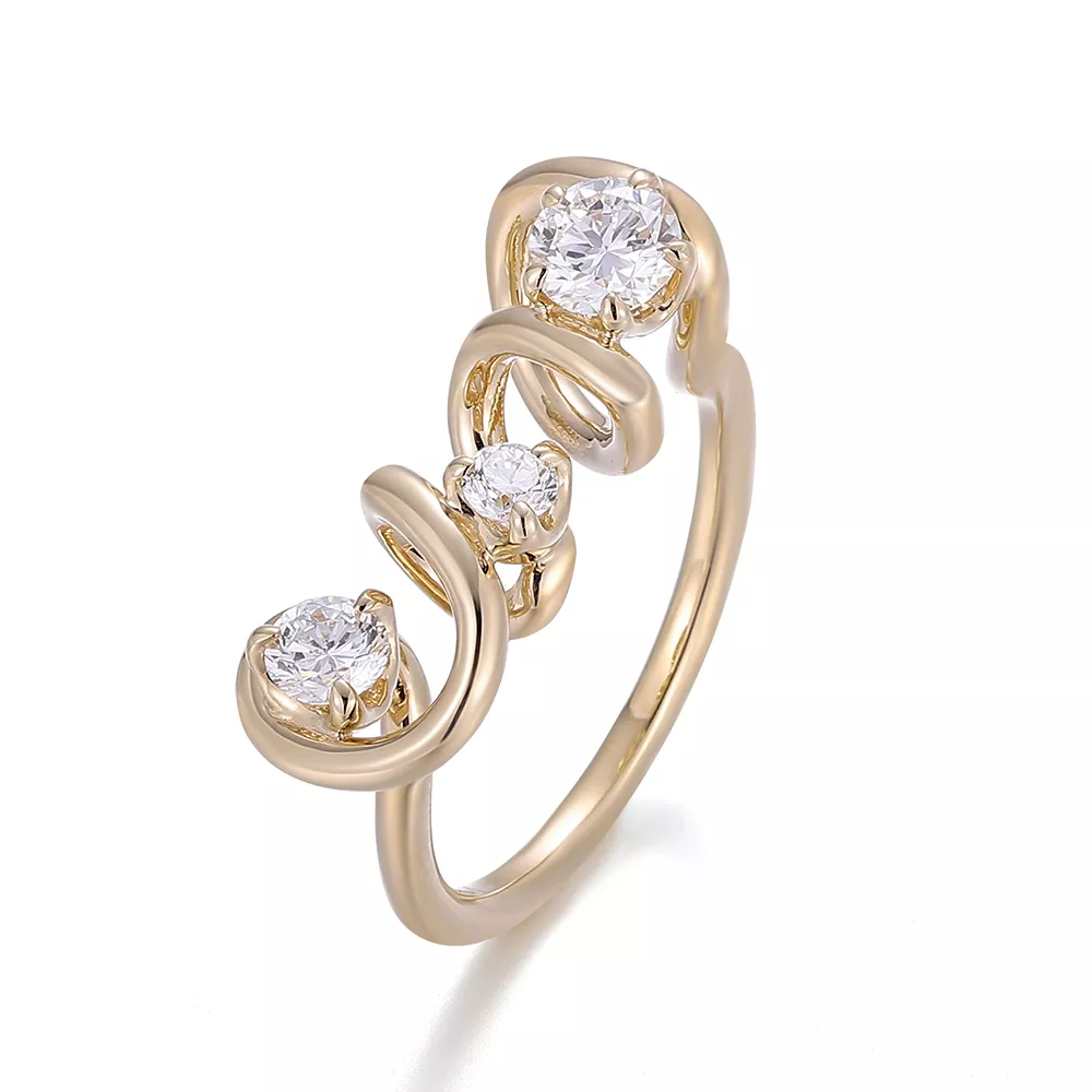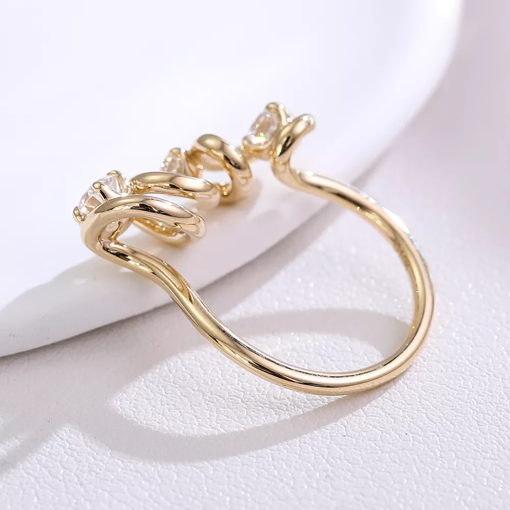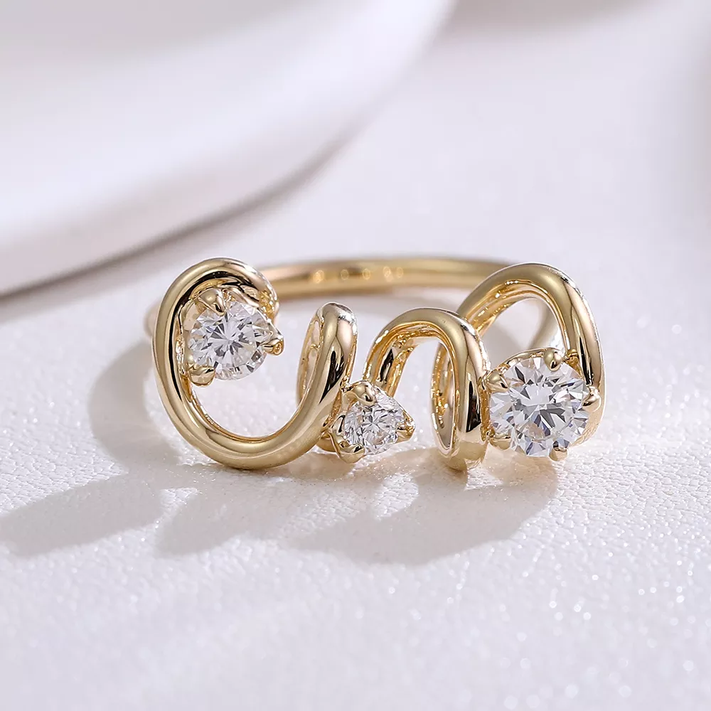 Trio Twisted Moissanite Ring stages three round-cut moissanites along a sculpted band, their precise downward sizing creating dynamic visual descent. Each gem is secured by four minimally beveled prongs in warm-toned gold, contrasting with stones’ ice-white scintillation. Engineered to transform the classic three-stone narrative through geometric choreography.A timeless symbol of refined taste — where craftsmanship meets enduring beauty.