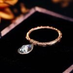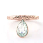 This unique green moissanit ring features floral engraved details on the ring arm, adding a touch of elegance to the overall design. Designed with innovation in mind, this ring allows the pear-cut green moissanite to rotate coaxially. This dynamic feature adds a modern twist to the classic design, showcasing the stone from different angles and further enhancing its sparkle.