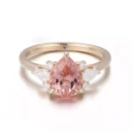 Whisper Pink Pear Cut Ring centers a soft pear-cut pink gemstone that radiates peach-hued warmth like morning light. Flanked by crystalline teardrop moissanites and twinkling micro-accent stones, they dance in a halo of light upon sculpted 18K gold vines. Where sustainable elegance embraces artisanal poetry for the refined romantic.