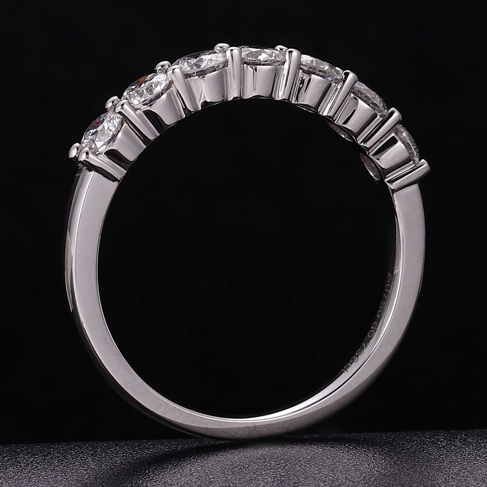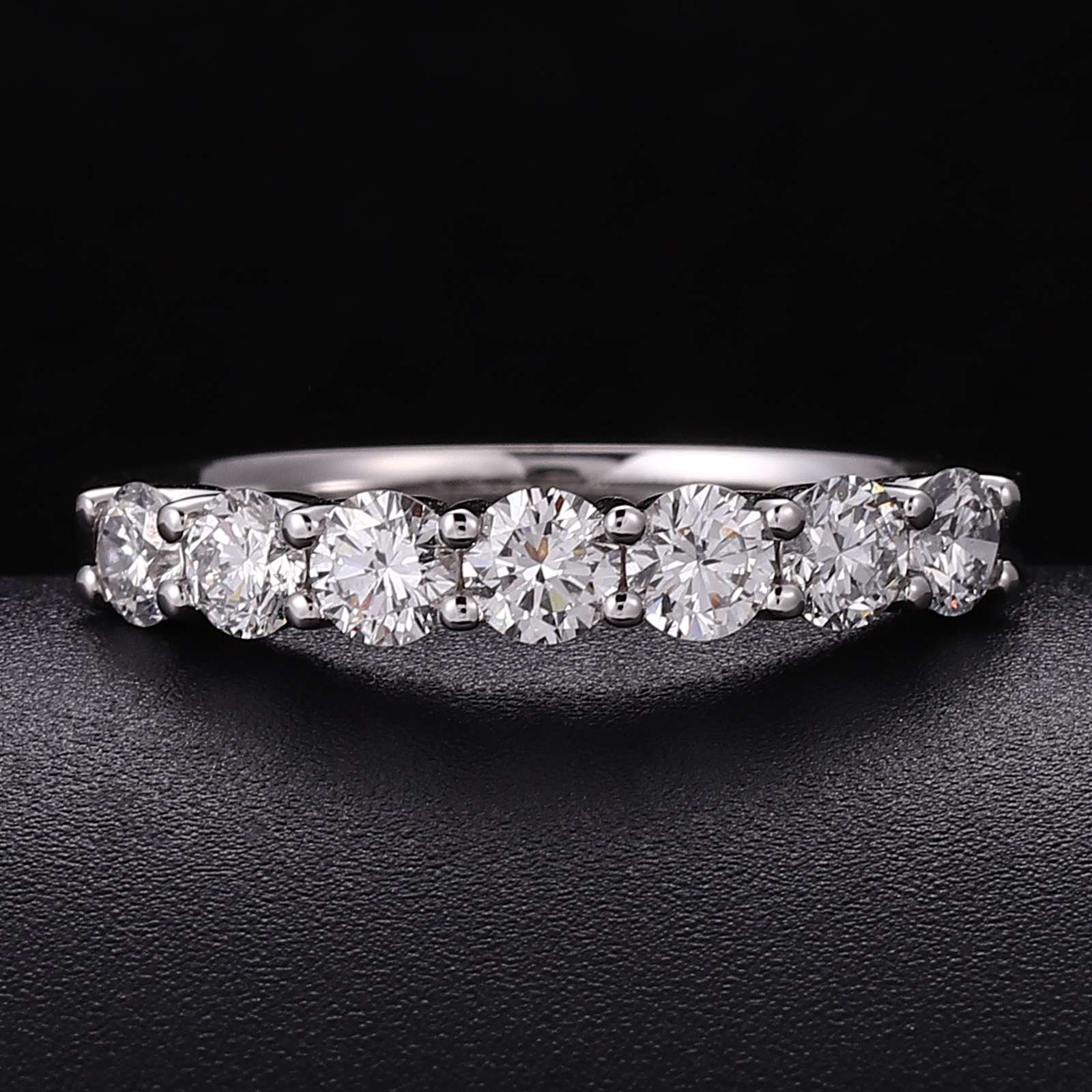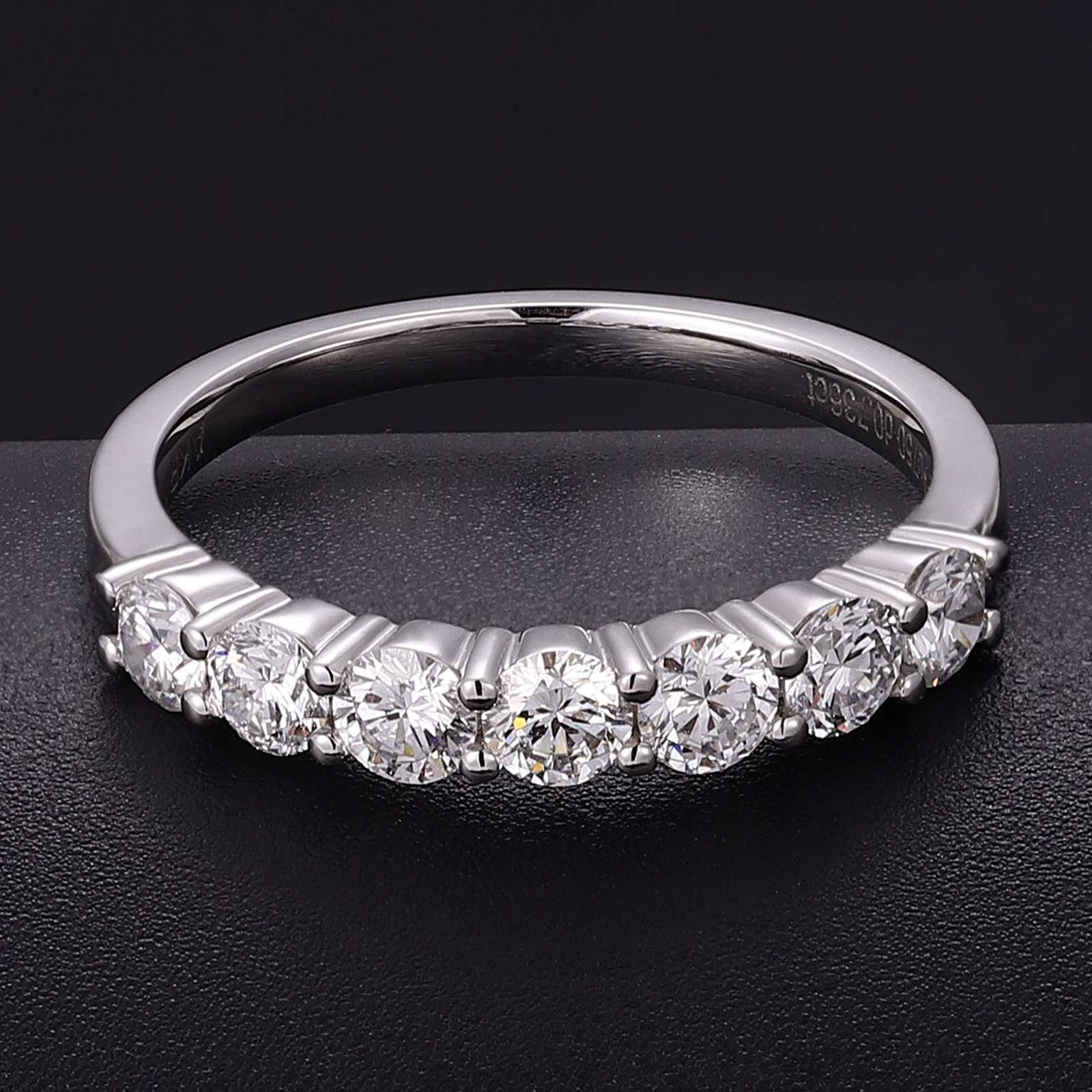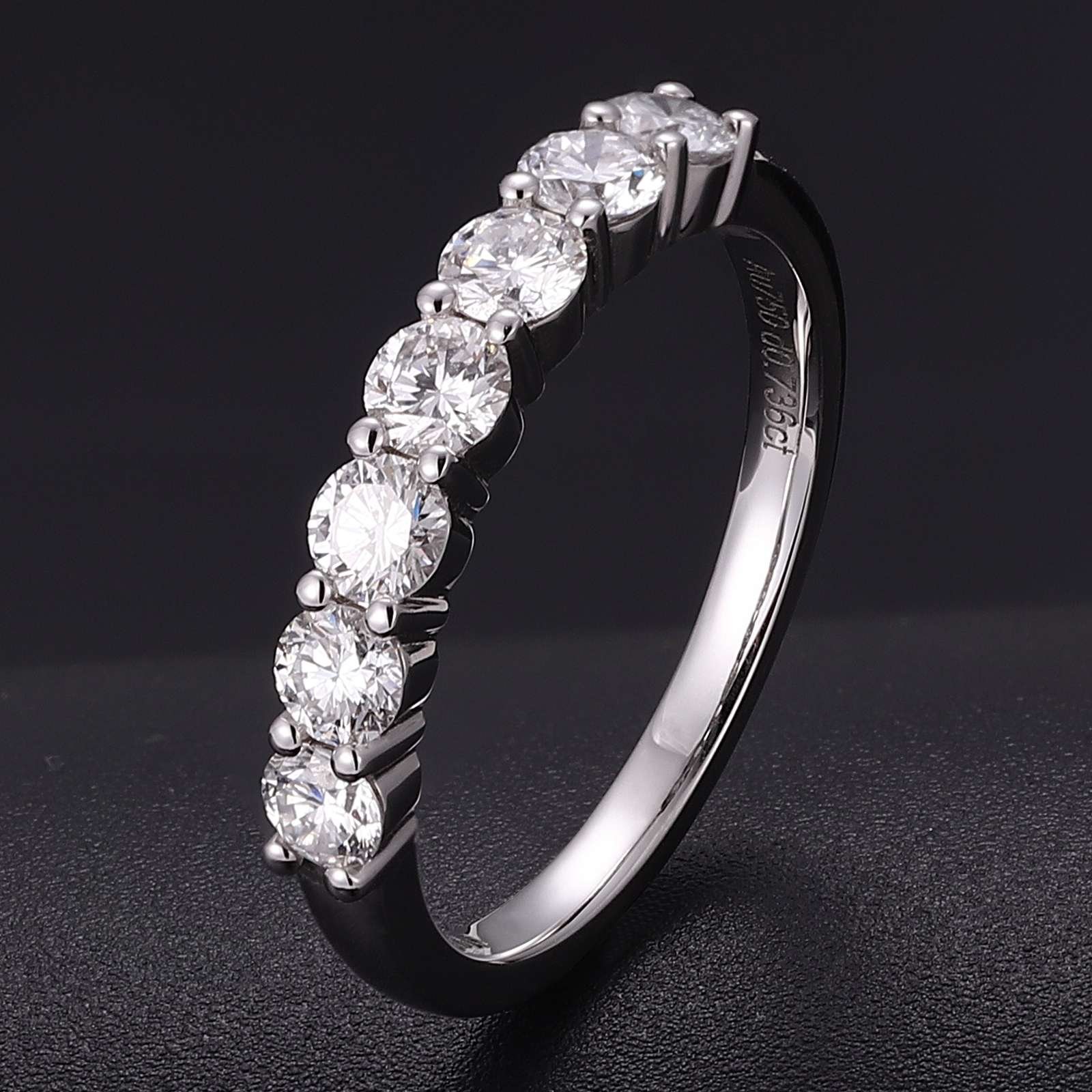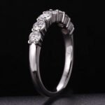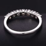 This white gold band ring is a symbol of refined elegance. It showcases a line of magnificent round cut lab diamonds, each precisely set to highlight their exceptional sparkle. The uniform round cut diamonds capture and reflect light brilliantly, creating a continuous, eye catching shimmer. The smooth white gold band provides a sophisticated backdrop, enhancing the diamonds’ radiance. Perfect for those who appreciate understated luxury and timeless design, this ring is suitable for any occasion, adding a touch of glamour to your look.
